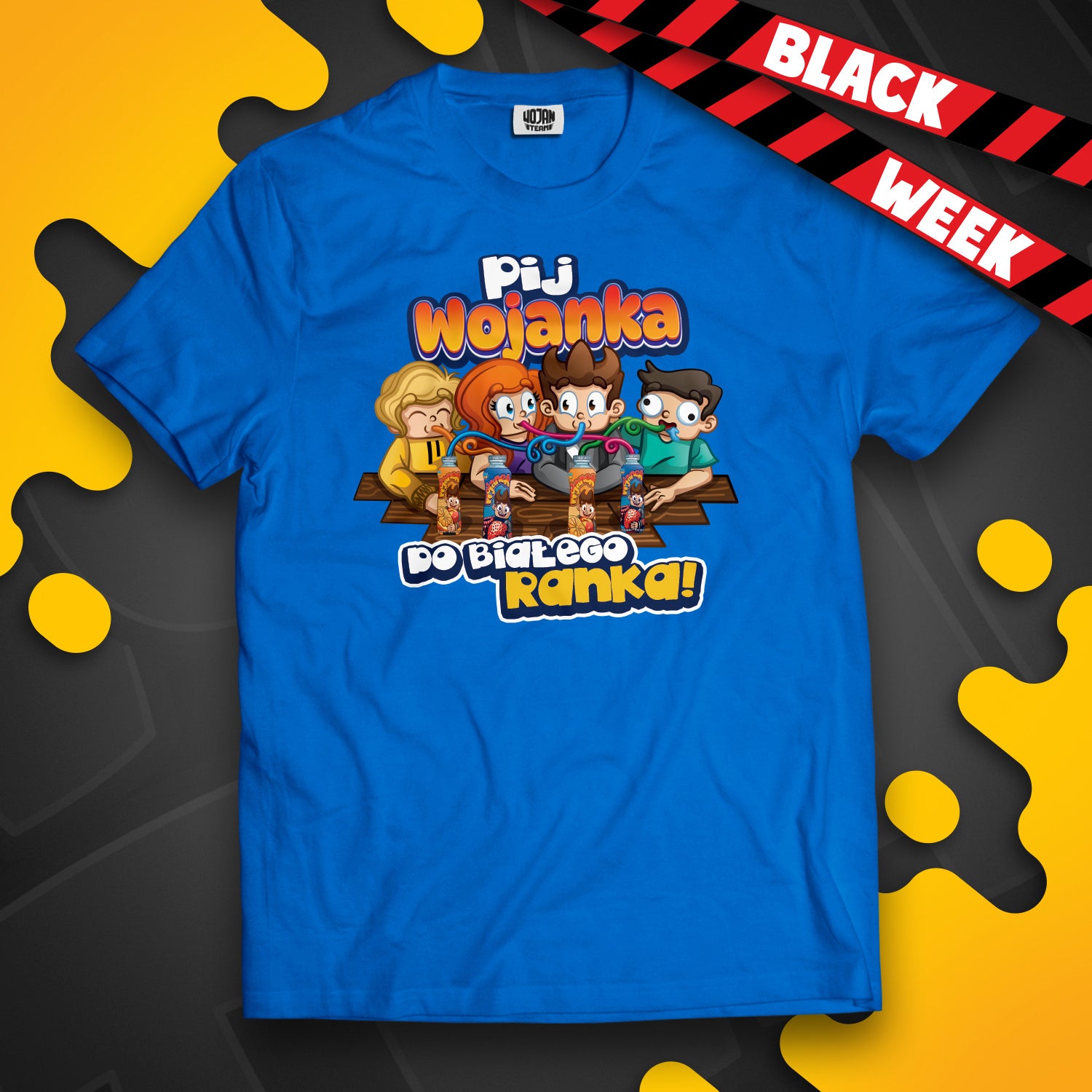 Wskocz do świata Wojanowic z nową koszulką w kolorze niebieskim! Na grafice ulubieni bohaterowie z Wojan Teamu siedzą razem przy stole i wspólnie piją Wojanka – ulubiony napój wszystkich fanów! 🥤