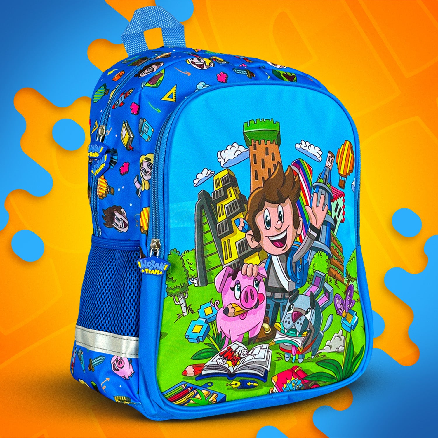 Plecak Wojan Team wyróżnia się oryginalnym wzorem full print, który pokrywa całą przednią część plecaka. Grafika przedstawia postacie z Wojanowic, takie jak Wojan, świnka Halinka i Pimpek, tworząc żywy, kolorowy i dynamiczny design. Całość wzoru dopełniają budowle z Wojanowic w tle, które nadają mu wyjątkowego stylu.