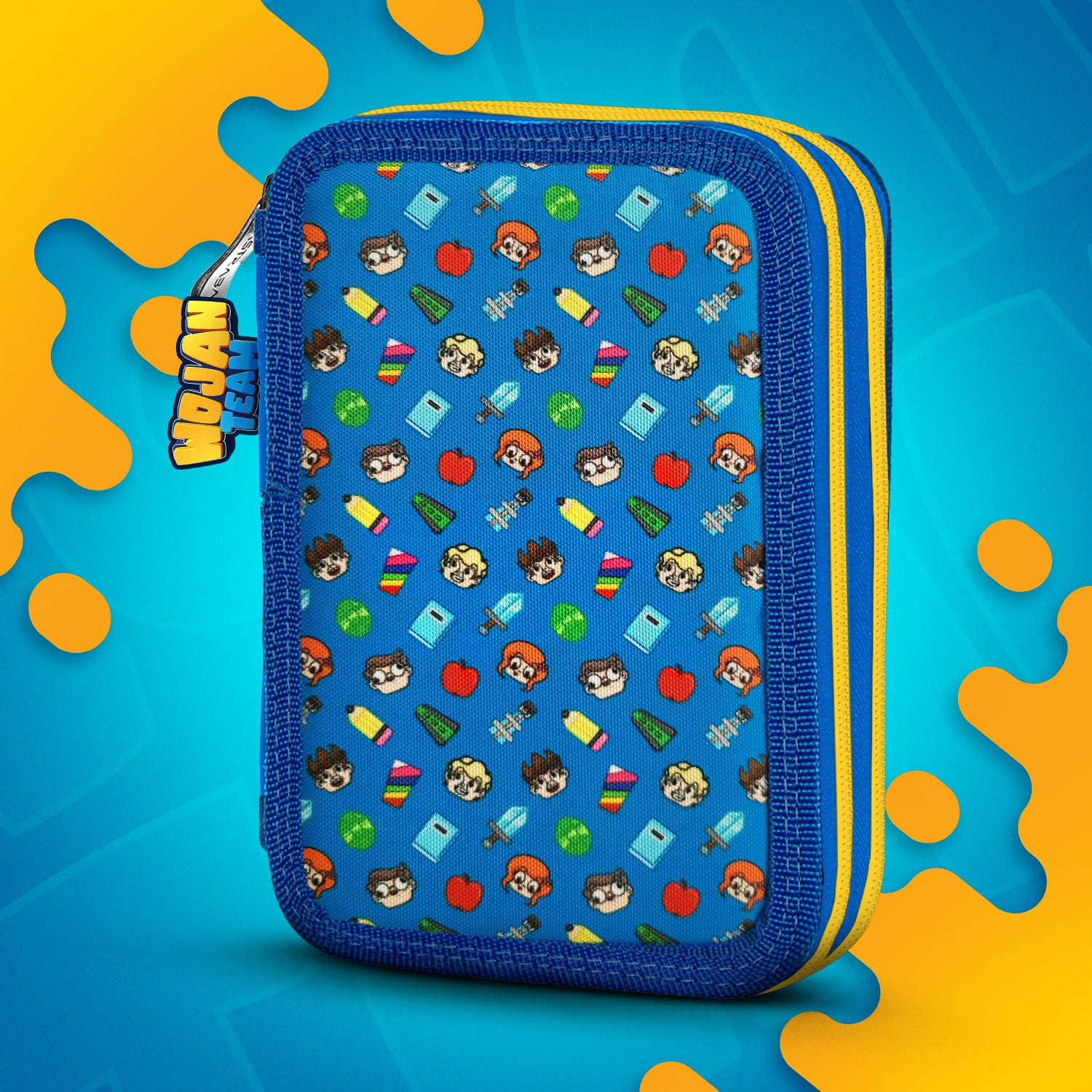 Piórnik przyciąga wzrok niebieskim kolorem, dynamicznymi grafikami i kolorowym logo Wojan Team na froncie. Motywy szkolne oraz logo Wojan Team zdobią nie tylko zewnętrzną część, ale i wnętrze oraz wszystkie akcesoria – to kompletny świat Wojanowic zamknięty w jednym piórniku!